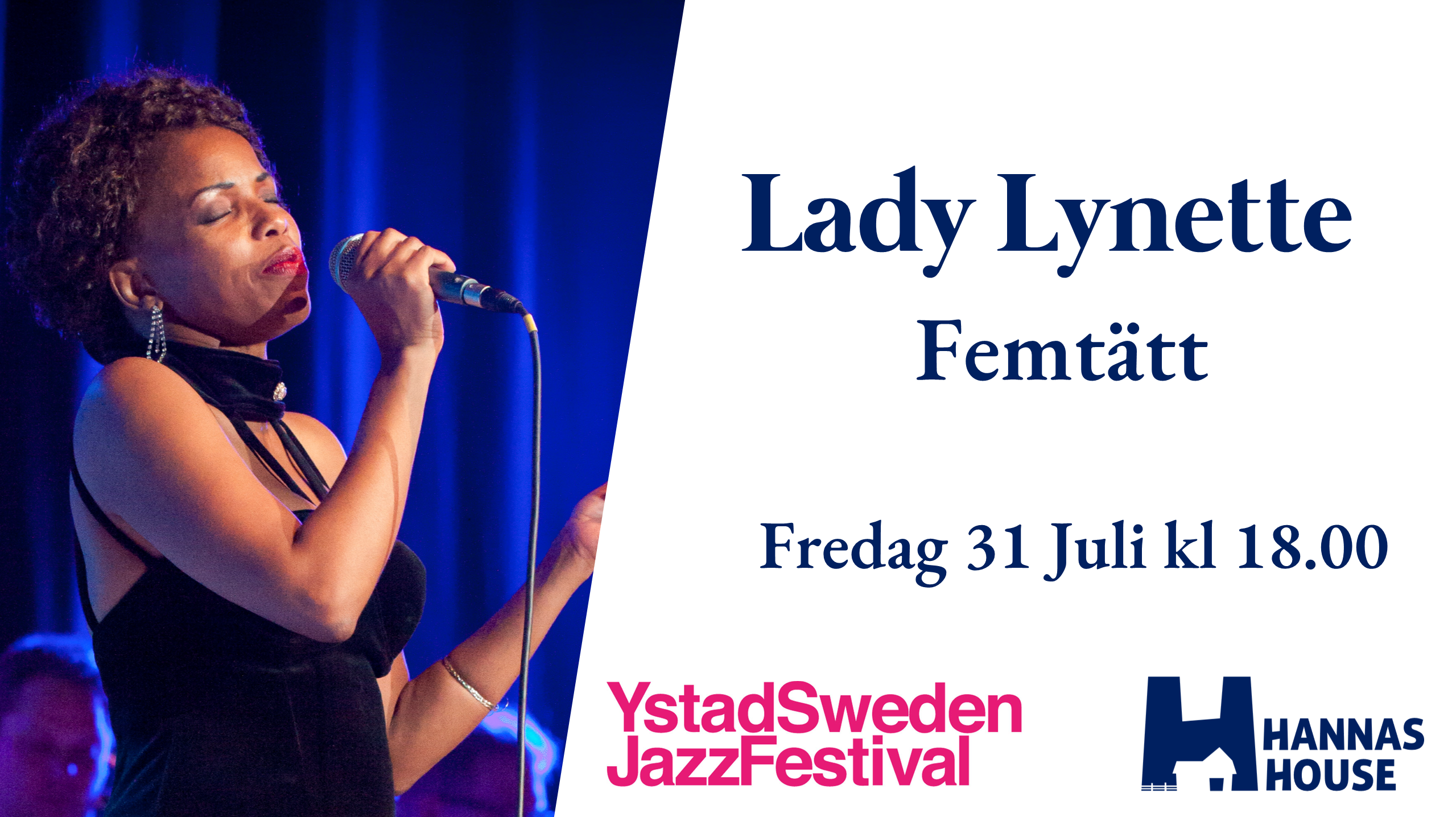 Fredagen den 31 juli under YstadSweden JazzFestival blir det kvällskonsert med underbara jazz- och soulstjärnan Lady Lynette Koyana Bjerstedt. Jazz med ett stänk av soul och blues. Lynette har för kvällen tagit med sig några av Sveriges finaste jazz-musiker: Lennart Gruvstedt - trummor Johnny Åman - bas Sven Bjerstedt - piano Inge Petersson Lindbäck - sax & flöjt Jazzsångerskan Lady Lynette är född i Sydafrika och uppväxt i Sverige. Hon behärskar flera genrer. Under 90-talet turnerade hon i Japan som soul/popsångerska. Lynette också har varit backup vocalist åt Tom Jones samt uppträtt med Count Basie-trummisen Butch Miles. Hennes konserter och album möts av fina omdömen. Lynette presenterar jazz med ett tidlöst sound. ”… witty and warm, swinging stage personality enables her to get under the skin of both her songs and her audience.” ”Pure pizzaz!” Vår populära sommarbuffé ingår i konserten. Hembakat bröd & smör, ostar och marmelad. Sillar med tillbehör, fräscha sallader och soppa. Grillade kamben, husets buffalowings, viltfångad fisk. Grillade grönsaker och husets makalöst goda ostpaj. Rostad potatis. Goda såser och tillbehör såklart. Och slutligen kaffebuffé med dessert.