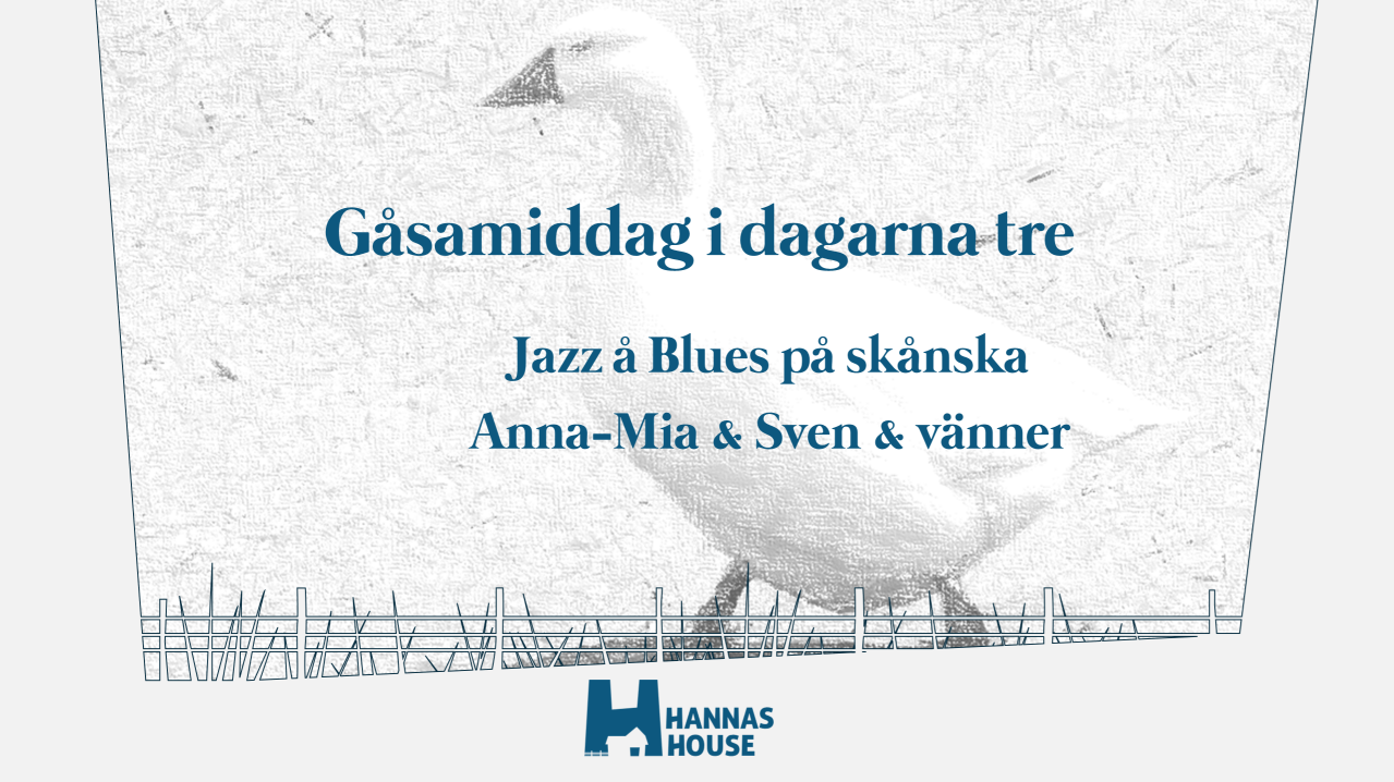 Gåsamiddag med konsert i Hannas House! Vi firar i dagarna tre! Det blir blues och jazz förstås på sjungande, klingande skånska med Anna-Mia och Sven och gästande musikervänner. Anna-Mia Barwe - Sång Sven Wickström - Gitarr och sång Gabriel Pyk Waite - Bas Sven Bjerstedt - Piano På buffén serveras det hemlagad kryddig svartsoppa, svampsoppa med portvinsgrädde, ugnsstekt gås med de klassiska tillbehören rödkål, ångkokt potatis, brysselkål, katrinplommon, gräddsås och kaneldoftande äpplen. Och till dessert Hannas House äppelkaka med hemmagjord vaniljsås och vispgrädde. Kan inte bli bättre! Frågan efter biljetter är stor så häng på låset.
