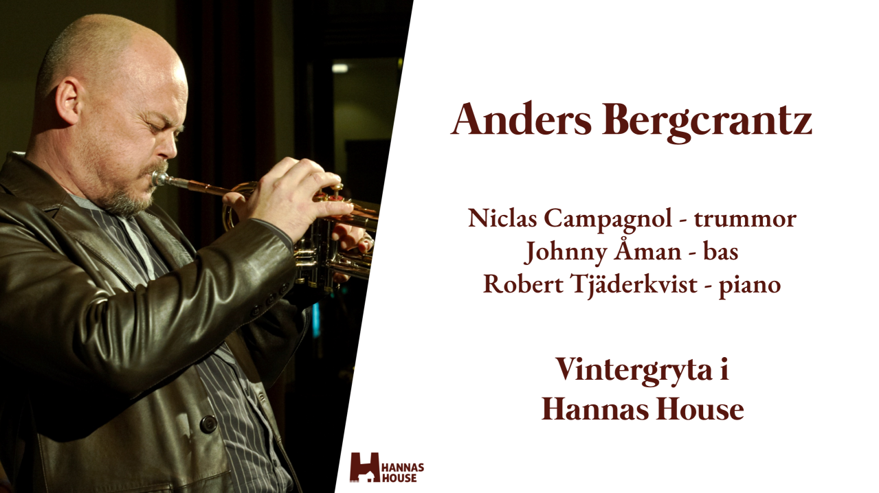 Hard Bop med världens främste jazztrumpetare! Vi är såå stolta! Vår storfavorit, från den skånska myllan, Anders Bergcrantz, som genom åren har vunnit mängder av musikpriser och är en mycket omtyckt artist, kommer till oss i Hannas House! Och med sig tar han gräddan av jazzmusiker. Niclas Campagnol! Johnny Åman! Robert Tjäderkvist! Aadu! Vintergrytan den här aftonen blir Chicken Pot. Starkt förstås, med curry! Också vegetarianen får det hett. Till detta får du Barwes ris, sallader och hembakade bröd. Efter maten bärpaj med grädde och kaffe. Anders Bergcrantz - trumpet, flygelhorn Niclas Campagnol - trummor Johnny Åman - bas Robert Tjäderkvist - piano