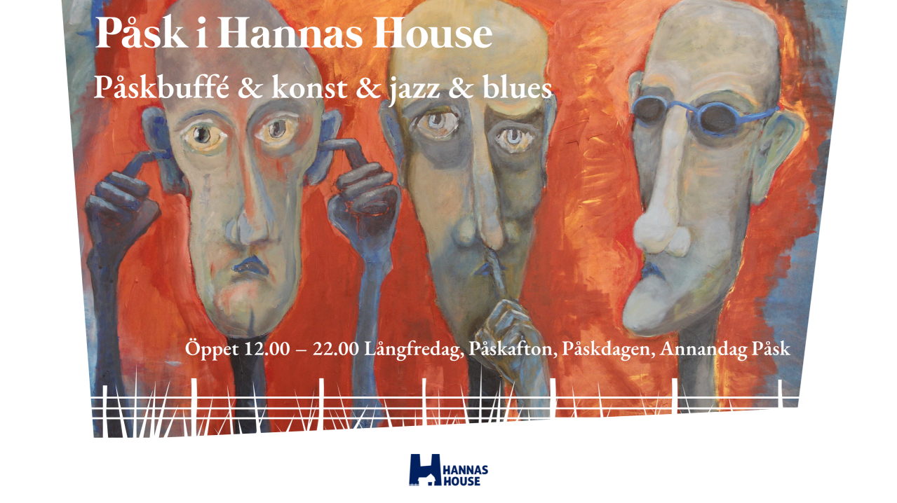 Påsk i Hannas House Målningar: ”Ångest i Glada Färger” av Anna-Mia Barwe På scen: Jazz & Blues med Wickström & Barwe Mat: En alldeles förtjusande påskbuffé serveras från 12.00 för ringa 375:-. Barn 3 - 7 år betalar 75:- och 8 - 12 år 125:-. Enbart kaffebuffé kostar 95:-. Hembakat bröd, Wickströms sill och lax, lammfärspaté, kokt påsk-skinka med pepparrot, ekologisk kycklingben, Hannas House ostpaj, grillade grönsaker, sallader, bönor och linser. Kaffe och kladdkaka med apelsingrädde. Bara att slinka in men vill du boka bord, ring 070-779 14 01. Varmt välkomna!